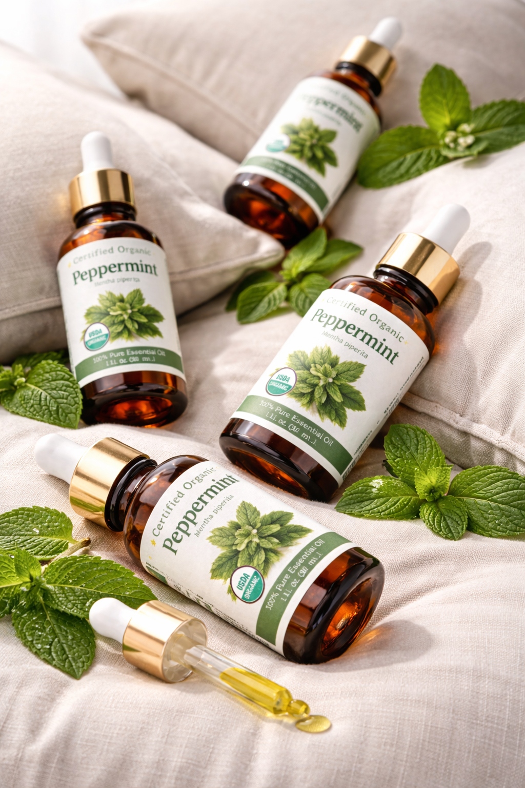 Organic Peppermint Oil can be integrated with other aromatic oils like marjoram · cedar wood · lemon · bergamot · Basil · spearmint · niaouli · rosemary · pine · lime · cajeput · thyme